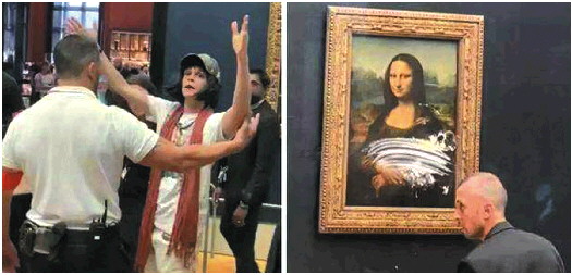 此外,欧洲其他一些环保组织也进行了类似活动。5月30日,法国巴黎卢浮宫展出的世界名画《蒙娜丽莎》遭蛋糕“袭击”。当天参观展览的一个坐轮椅、戴假发的男子突然站起来,将蛋糕抹在名画《蒙娜丽莎》上。幸好画作有防弹玻璃保护,没有遭到破坏。据报道,这名男子被安保人员带走时大喊“想想地球吧”。这一行为引发大量关注,此后其他环保组织不断效仿,世界名画纷纷“中招”。