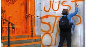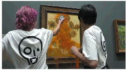 进入10月,该组织的活动更加频繁。10月14日,在伦敦特拉法加广场的英国国家美术馆,两名年轻人趁人不备,迅速打开手中的罐头盒,向梵高名画《向日葵》泼洒番茄汁……《向日葵》价值约7250万英镑(约合5.8亿元人民币),好在这幅名画在玻璃罩的保护下没有遭到损坏。当天下午,又有该组织成员到伦敦警察局总部新苏格兰场附近抗议,并把警务中心的标志喷涂上橙色油漆。而这已经是他们连续第14天进行激进的抗议行动,此前他们在几条主要道路上静坐,导致交通阻塞。