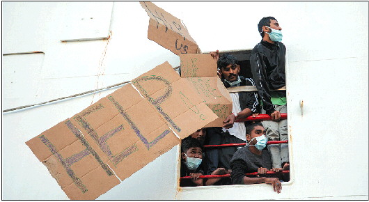 8日,在意大利西西里岛卡塔尼亚港,“格奥·巴伦支”号救援船上的移民手举表达上岸诉求的字牌。 新华/美联