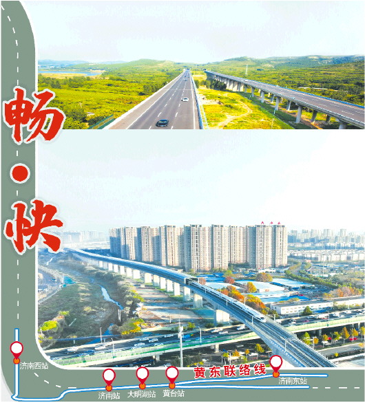 胶济铁路至济青高铁联络线(黄东联络线)于11月16日正式通车运营,济南三大火车站实现互联互通,济南站至济南东站列车运行最快17分钟可达,济南至青岛北由最快2小时18分缩短至1小时45分。黄东联络线通车后,济南“米字型”高铁添上了关键一笔。