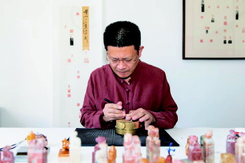 崂山印社社长、崂山区书法家协会副会长王海明在沙子口街道新时代文明实践特色工作室内创作篆刻作品