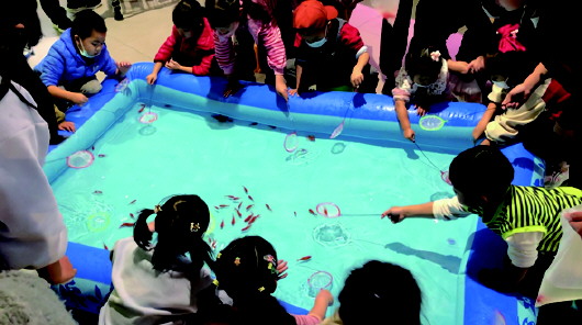 在亲子游戏互动区,孩子们早早的拿上小渔网围着鱼池翘首期盼,一声“活动开始”犹如比赛发令枪一般,“小运动员”们争前恐后的捞了起来……