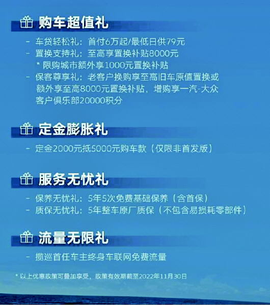除了极具竞争力的上市指导价外,揽巡还通过极具吸引力的购买和服务政策,最大化回馈用户的厚爱。即日起至11月30日,用户购车将享受多重超值礼遇,其中“购车超值礼”包含首付6万元起/最低日供79元的“车贷轻松礼”;至高8000元置换补贴,限购城市额外享1000元置换补贴的“置换支持礼”;老客户换购至高旧车原值置换或额外享至高8000元置换补贴,增购享一汽-大众客户俱乐部20000积分的“保客尊享礼”。同时,购车用户还将享受定金2000元抵5000元购车款(仅限非首发版)的“定金膨胀礼”,以及享受“服务无忧礼”,包括5年5次免费基础保养(含首保)的“保养无忧礼”和5年整车原厂质保(不包含易损耗零部件)的“质保无忧礼”。此外,还可享受揽巡首任车主终身车联网免费流量的“流量无限礼”。多项好礼可叠加享受,给足用户满满的诚意与惊喜。
