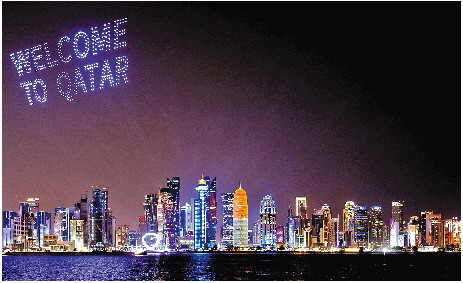 11月14日在卡塔尔多哈拍摄的无人机表演和城市夜景。