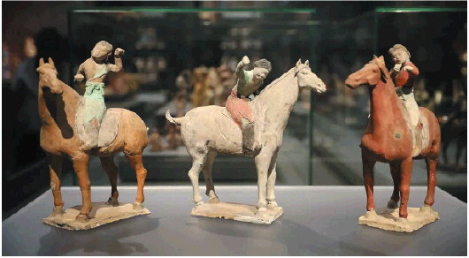 唐代也有女子马球运动。唐代的女子并没有在运动量大、危险性强的马球运动前畏缩不前,而是踩蹬上马,奔驰在球场之间。郭英义任剑南节度使时,在成都聚集了许多女人骑驴击球,以此为乐,而且还特制了驴鞍和球衣,一天就要耗费数万,十分奢侈。1981年9月,考古工作者在陕西临潼山的一座无名氏的唐墓室里,发现了四件小巧玲珑、造型生动的白陶彩绘打马球俑。俑马通高7厘米,骑者全是宫女形象,头挽茧形髻,身着异色紧身坎肩,左手挽缰,右手上扬,伏身向前作马上击球之势。可见,马球运动对唐代妇女来说也充满着吸引力,以致红妆驰马击球者时有人在。