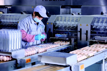 在鸡蛋厂房内,工人们正在有条不紊地进行流水作业,鸡蛋产出后,经过杀菌、消毒、喷码、分级、包装一系列的工序,一箱箱无菌鸡蛋“新鲜出炉”。