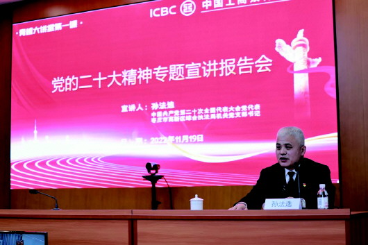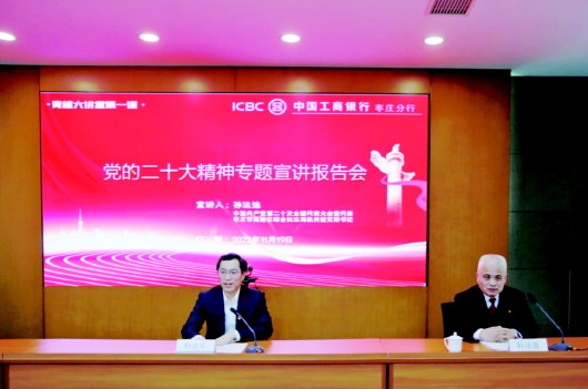 为深入学习贯彻党的二十大精神,2022年11月19日上午,工商银行枣庄分行举办党的二十大精神第一期专题宣讲报告会暨“青檀大讲堂”(第一期)培训,邀请党的二十大代表、枣庄市高新区综合执法局机关党支部书记孙法选同志来行作专题宣讲报告。枣庄分行党委书记、行长孙吉军主持会议。