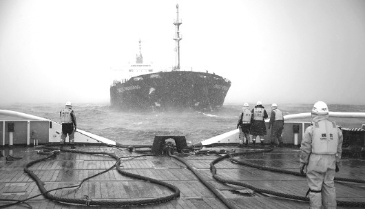 近日,一艘利比里亚籍散货船在威海东北30海里处主机故障失去动力,船上29人被困。风雪交加的情况下,交通运输部北海救助局连续奋战两天两夜,最终成功将遇险船舶拖至烟台港2号锚地,船上29人随船成功获救。记者 李雯娅 通讯员 乔靖 摄影报道