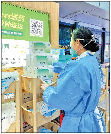 8日,漱玉平民大药房西门店店员正在把核酸检测试剂盒摆上货架。