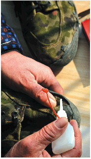 每天走山路鞋子容易坏,老刘就买来胶水粘好继续穿。