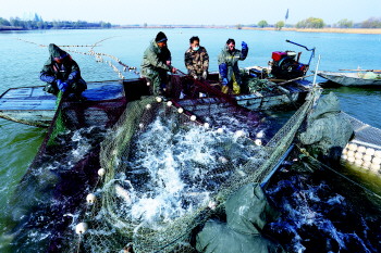 比捕鱼师傅还激动的是正在岸边等待的客商,当天凌晨3点,客商杜秉禹开着货车,特意从临沂莒南县赶到太白湖景区收鱼。当满载着鲢鱼的鱼排驶向岸边时,看着肥美的鲢鱼活蹦乱跳,他按捺不住内心地喜悦:“当天要拉走四五千斤,还有几辆货车随后几天会陆续到达,今年收购十万斤不是问题。”杜秉禹告诉记者,自己家里有7000亩的鱼塘用于养殖收购至各地的鱼类,再销往全国各地,太白湖的鲢鱼在临沂本地每斤能卖到7块钱,最远的地方能卖到四川。当然,这样销售首先得有底气,“鱼品质要好,太白湖的鱼,肉紧实,味道鲜美,人家一吃就明白,这样回头客就多了。”