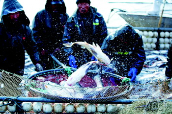 满载着鲢鱼的鱼排靠岸后,为了加快装车速度,还用上了吊车,捕鱼工人将符合规格的鱼一条条丢进鱼篓中,然后由吊车吊上停在岸边的运鱼车上,装满鱼的鱼篓能达到六七十斤。运鱼车上有专门的供氧设备,这样能保证鱼运到目的地后依然是鲜活的。