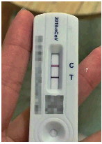 ◥检测区(T)呈深红色的抗原检测结果。