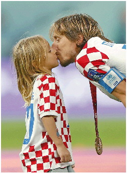 本场比赛结束后,莫德里奇与他的三个孩子一起在球场上分享胜利后的快乐,他拉着女儿的双手,像跳舞一样在绿茵场上将她抛起。这一刻,对他的女儿来说是最幸福的,“魔笛”的世界杯最后一舞,仍然和你一起跳。