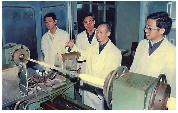赵梓森(右二)早年在武汉邮科院研制光纤。