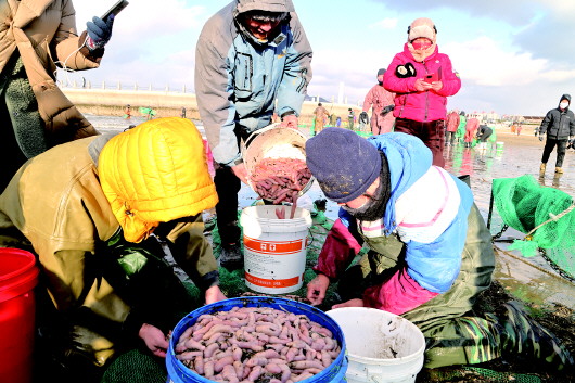 12月18日,一场风雪过后,烟台芝罘区幸福八村附近海滩出现大量海肠,吸引了不少市民前来“进货”。