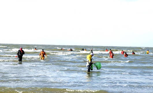 “爆网了!爆网了!”当天下午三点多,记者来到幸福八村附近海滩,只见陆续有穿着皮衩拖着网的市民从海里回来,随之而来的是此起彼伏的喊叫声。尽管当天气温在零摄氏度以下,且风大浪急,但丝毫不影响大家赶海的热情,整个海滩上人来车往,大家都沉浸在收获的喜悦中,