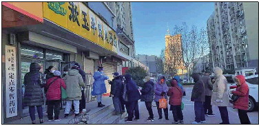 22日,济南市民排队在漱玉平民药店领取免费布洛芬。