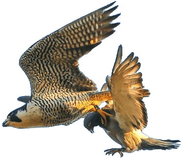 游隼喜欢停栖在视野开阔的高处,当它发现猎物后,会突然起飞,高速追上,迅速伸出强健的脚掌,猛击猎物头部或背部。这一击非同小可,可以一下打掉鸽子或乌鸦的头。更恐怖的是,有人见过它一掌狠击在苍鹭的背脊上,瞬间打出了一个鸡蛋大小的孔洞。