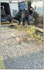 记者通过市民发来的视频看到,在莱西湖水库岸边,一只老虎卧在路边的草丛里,神态安详,看似并无敌意,路过车辆的司机纷纷停车注目。而在市民发来的另一个视频中,这只老虎好像被麻醉,身体一动不动,4名工作人员正准备将老虎抬上车。