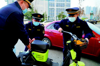 早晨9点,在太白湖新区圣贤路太阳岛便民疏导点附近,几个颀长的身影已立在路边,他们不时地停下巡查的脚步,或将乱停放的共享单车和电动车抬放摆正,或让商铺业主将出店经营的物品收回店内。带队巡查的是太白湖新区执法分局执法一大队二中队中队长谢宝龙。“我也算是老城管了,干了10年,这几年群众对城管的工作要求更高了,我们也从自己工作的角度在摸索更人性化的执法方式。和朝九晚五不一样,我们是两班倒。白班早上9点到下午5点半,晚班是下午5点半到晚上9点。”谢宝龙介绍,城管日常巡查整治的内容很多,仅较为熟悉的就有市容市貌、出店经营、门前三包、车辆乱停放、违建巡控、乱张贴、油烟乱排放、噪音扰民等。