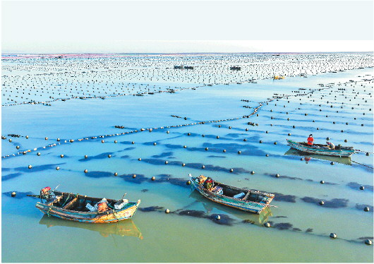 12月27日,在威海荣成市俚岛湾海洋牧场海上养殖区,渔民驾驶渔船清理养殖筏架上的敷草(无人机照片)。 目前,荣成市各大海洋牧场贝类、藻类养殖正处于冬季管护期,渔民们驾驶渔船在海面上穿梭,进行添加养殖浮漂、清理海草及投喂饵料等作业,呈现出一派“海上冬耕”生产的繁忙景象。 新华社发