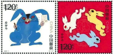 中国邮政发行的《癸卯年》特种邮票一套两枚。其中,第一枚邮票名为“癸卯寄福”,黄永玉用蓝色描绘了一只右手执笔、左手持信的卯兔。第二枚邮票名为“同圆共生”,描绘了三只兔子首尾相接、奔腾不息的场景。不过,第一枚“癸卯寄福”里的那只兔子在网上引发了争议,蓝皮红眼兔可谓打破了人们对兔子的刻板印象。有网友留言:“中国邮政这是认真的吗?怎么看都透露着强烈的妖气啊!”还有人称,这只蓝色兔子看上去像恶魔,不大吉利。更有毒舌锐评:这哪是兔子,更像一只耗子成精,看起来不太对劲,“瞪着一双腥红邪眼,龇着一对雪白板牙,腮边两撮老鼠须,张着血盆大口,足下三只利爪。”