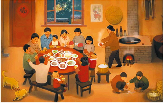 人生经年,岁月入味。我也曾年年踏上回家的路,那是去郑州看望岳父和岳母,我的父母早逝,那边的父母就是至亲长辈。忙到年根,搭上绿皮火车,从济南出发,下京沪,转道徐州,再上陇海线,要十二个小时的行程。我算了一笔时间账,省亲来回二十四小时,整整一个昼夜,当时假期五天,其中有一天是在路上度过的。出行是兴奋的,很快旅途的枯燥驱走了兴奋,小小的女儿开始打瞌睡。为了哄她,我指着车窗外说:你看,那里有一条狗!果然,一条黄狗在村头跑着。生在城里的女儿没见过狗,一下子来了兴趣,原来狗是这样走路的!她跳下座位,学着狗在车厢的甬道上爬,逗得邻座哈哈大笑。我说,咱们数狗玩吧。列车从一个个村庄旁驶过,有的村庄没有狗出来,有的村庄竟有三四条狗追逐着玩耍。当数到第十九条狗的时候,女儿趴在车窗边睡着了。我们这年轻的一家像候鸟一样归巢、远航,在一次次回归与返岗中眼见得父母老去。我的年味就是奔波的味,留在记忆中,终生挥之不去。