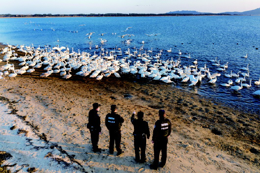 成山卫派出所天鹅湖生态警务工作站民警在天鹅湖景区开展巡逻踏查。