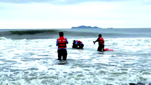 2022年8月9日,沙窝派出所民警迎着2米巨浪,利用水上救生机器人成功救助一名溺海男孩。