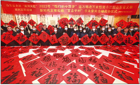 1月13日,2023年“我们的中国梦”送万福进万家暨第十二届山东省文联新时代文明实践“百县千村”书法惠民活动启动仪式在济南市历城区相公庄村举行。山东省文联党组书记何思清,省文联党组成员、副主席、一级巡视员矫红,省文联党组成员、副主席姜慧,中国书协副主席、省文联副主席、省书协主席、山东艺术学院书法学院院长顾亚龙,济南市文联党组书记、副主席刘浩,历城区委常委、宣传部部长魏宏新等出席。中国书协理事、省书协副主席王瑞主持启动仪式。