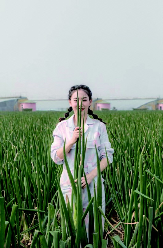 ◤满昱彤跟章丘大葱“比身高”。