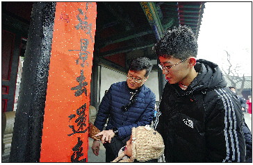 一家三口在孔府贴春联。