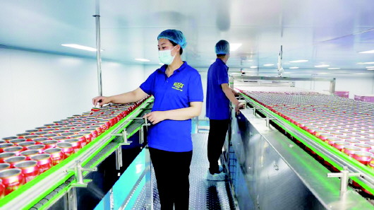 工人们在王老吉大健康产业园生产车间制作加工石榴特色饮品