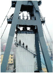 在主井架顶端平台,两个直径4.5米的天轮连接着多根钢丝绳,两人认真检查着天轮两侧的滑轮轴承,添加了润滑脂。“说不紧张是假的,井筒是煤矿的咽喉,我们的责任就是守好它,保障矿井的安全生产。”憨厚的王海峰说。“能上天,能入地,同事们的本事大着呢!”性格开朗的马斌笑着说,每天在1000多米的垂直工作面工作,他们早就练就胆大心细的绝活。
