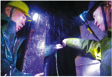 两人将半个身体探出罐笼外,冰凉的淋水如瓢泼大雨般落到身上。“一、二、三……”孟祥福用一把大扳手拧住螺母,查贤龙用力扭动扳手壁,当两人更换完螺母再次回到罐笼中时,双手下垂,袖口的水瞬间一条线流了下来。