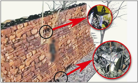中心现场北面是东西走向的围墙,紧靠围墙外有一渣土堆,渣土堆高度低于围墙约1.5米,渣土堆与围墙间有两棵树木,树木高于围墙。围墙内侧墙体上生长一棵向内斜生的树木,树干直径约11厘米,胡鑫宇尸体缢吊于该树树干凸起处,悬挂点距离地面4.5米,与围墙顶端垂直距离0.61米。