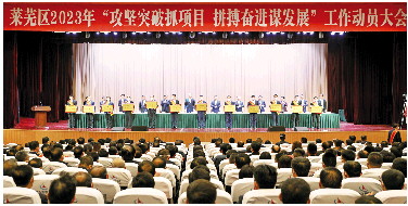 1月29日下午,济南市莱芜区2023年“攻坚突破抓项目 拼搏奋进谋发展”工作动员大会召开。会议全面贯彻落实全市“项目突破年”工作动员大会要求,引导全区上下以“开局就是决战、起步就要冲刺”的战斗姿态,跑好第一步、勇夺“首季开门红”,确保全年各项目标任务高标准推进、高质量完成。