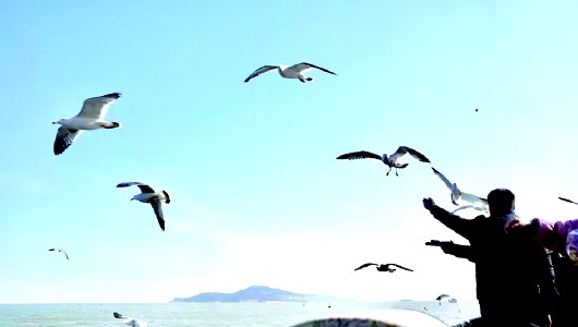 游客们购买鸥粮,将其抛洒到水面,海鸥竞相来食,在海面上成群飞舞,引得众多游客拍照留念。望着飞翔的海鸥,人群里不时的传出阵阵欢笑声。涛声、鸥鸟声、人们的欢呼声在幸福门前飘荡。