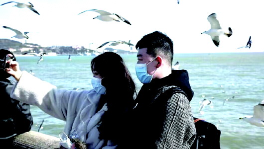 冬去春来,又是一个万物复苏的季节。成群的海鸥聚集在幸福门广场海边,引来大批游客在岸边围观,与海鸥上演着“甜蜜互动”。无论是展翅飞翔还是安静地在海面浮动;无论是身姿矫健捕食鱼类还是接住市民投喂的食物,可爱的“精灵们”在蔚蓝的大海上翩翩起舞,给茫茫的海天平添一派生气,为威海抹上了灵动的色彩。