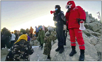 日出时分,泰山景区工作人员在游客集中区域维持秩序。 泰山景区供图