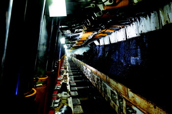 “机械联合运行准备开始!”话音刚落,梁邦功按下启动按钮、推动操作手柄,面前的大屏幕实时播放井下采煤一线的视频画面:直径2.3米的采煤机匀速前行,一头一尾两个滚筒飞速旋转,层层大块煤炭被切割而下,一排排液压支架自动跟机前移,滚滚乌金通过传送带运向地面。