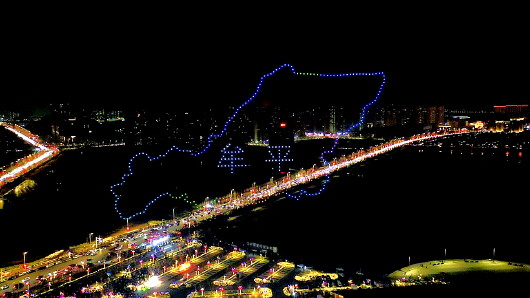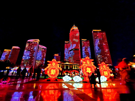 在烟台滨海广场,十一栋楼宇上演元宵节主题灯光秀,吸引了不少市民前来打卡。