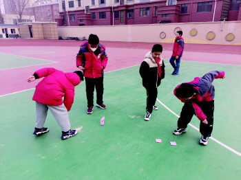 奎文区明德学校的孩子们在操场上进行打“宝”比赛。