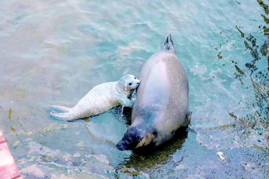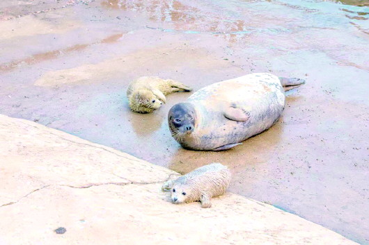 新的一年,喜事连连!近日,烟台东炮台景区海豹湾喜添三只小海豹,毛绒绒的海豹宝宝跟随海豹妈妈一会在水中嬉戏,一会在岸边晒着太阳,非常惹人喜爱。