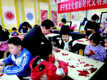 张跃广在任城区济阳街道的非遗传习所内为孩子们传授剪纸技艺。
