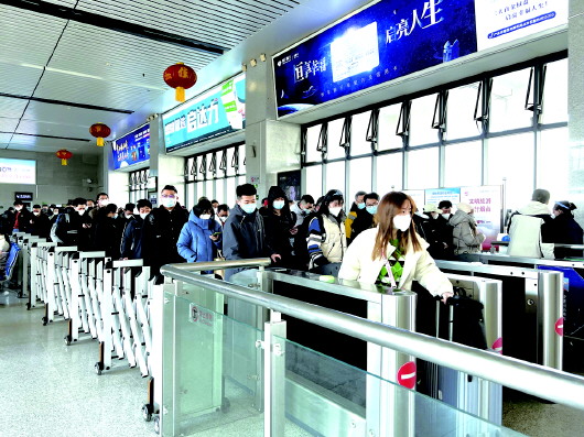 候车室里的旅客人数明显增多,旅客们有序排队安检进站。