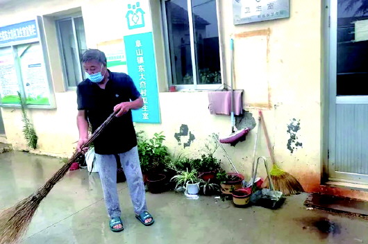 刘中军在卫生室前打扫卫生。