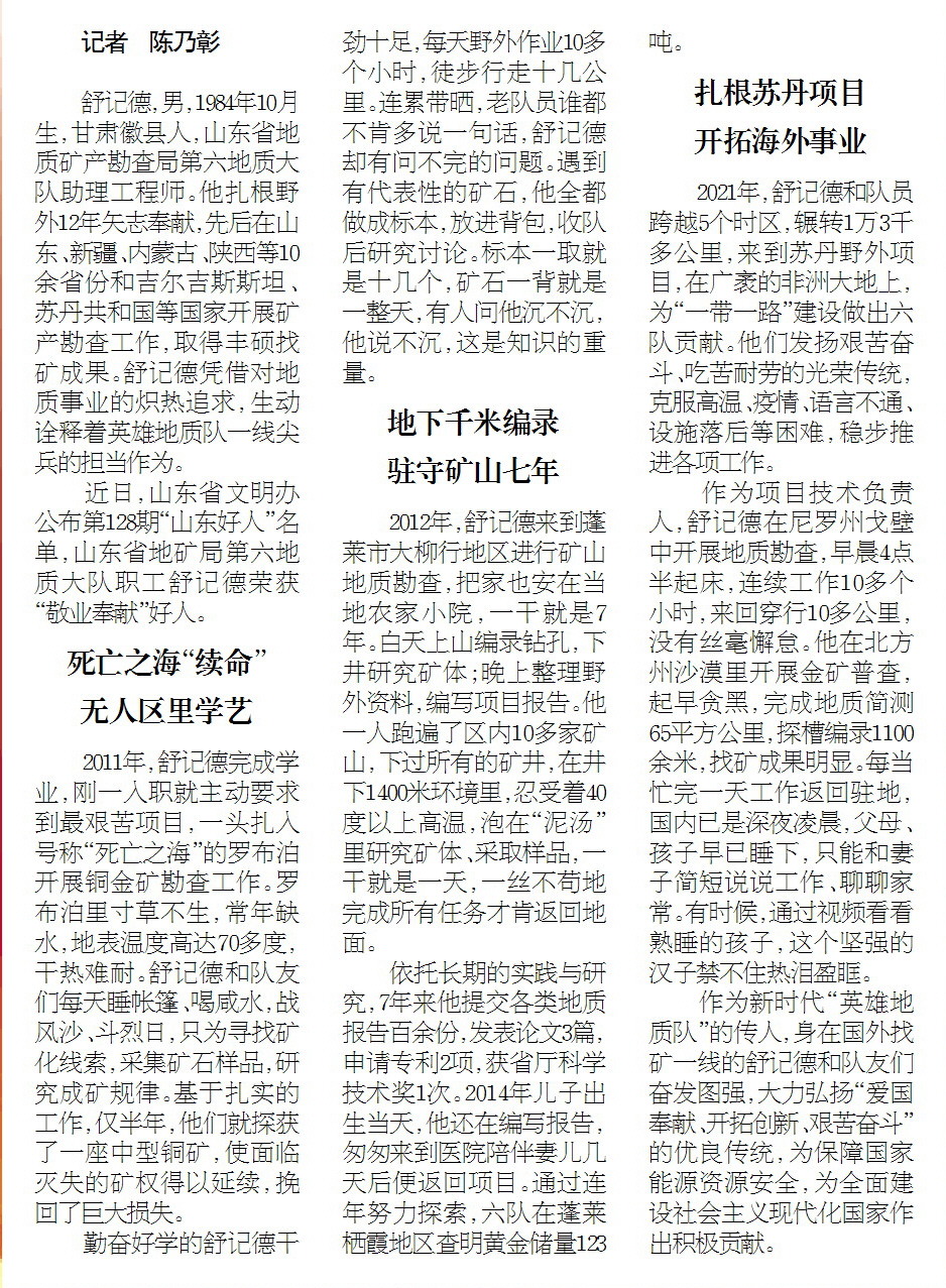 近日,山东省文明办公布第128期“山东好人”名单,山东省地矿局第六地质大队职工舒记德荣获“敬业奉献”好人。