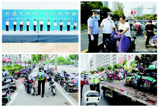充分发挥创建全国文明城市交通秩序整治主力军作用,隆重举行“创建文明城 我们共行动”主题宣传暨交通秩序整治攻坚誓师大会,动员全警“每天奉献两小时、齐心协力促创城”,支队班子成员率先垂范,每天带领机关民警下沉路面一线,在早、晚两个高峰时段主动加勤,加大对重点路口、重点路段的巡逻管控力度,累计劝阻不文明交通行为69万余人次,其中,劝导不戴头盔45万余人次,处罚6.6万余人次,城区主干道头盔佩戴率由原来的15%提升至90%以上。“白衬衫”路面一线执勤被多家媒体转载报道,受到社会各界高度赞扬。